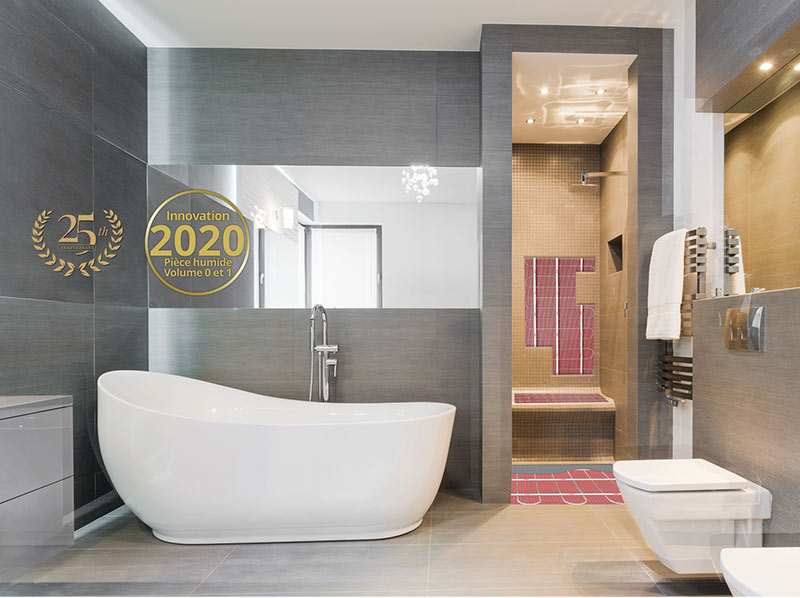 De StickyMat 12V oplossing werkt op zeer lage spanning en voldoet aan de beperkingen van NF C 15-100, waardoor je veilig volume 0 en 1 van badkamers kunt inrichten.
